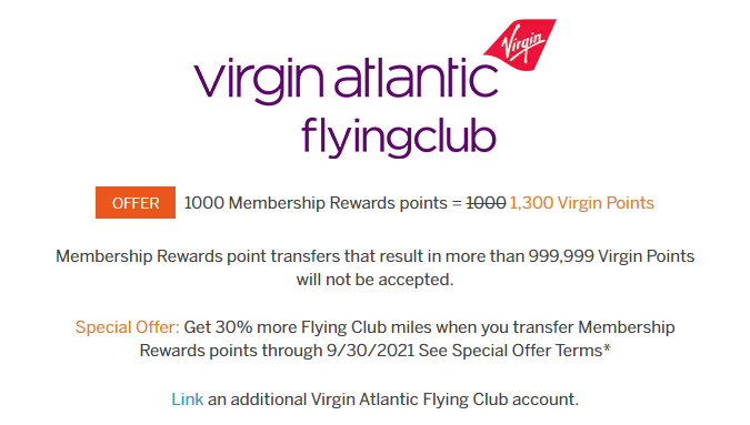 - Receive a 40% bonus when you transfer Membership Rewards points to Virgin Atlantic Flying Club. Here are step-by-step instructions on how to transfer Amex points.