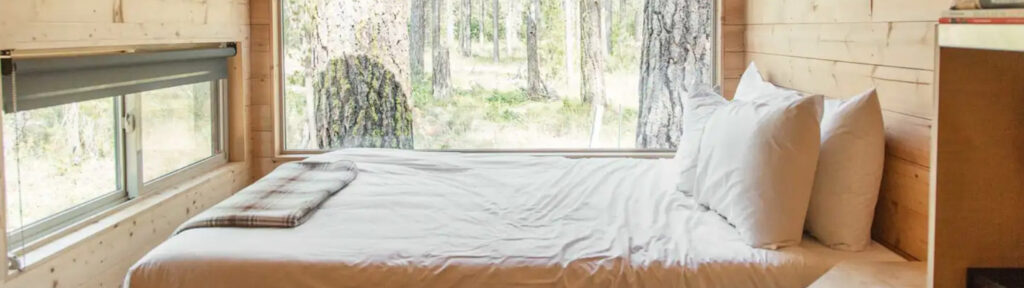 Each cabin includes an en-suite bathroom, a kitchenette, and a workspace. However, you won’t find a TV or computer set-up; these cabins are designed to help you disconnect from the busy world.