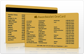 AwardWallet OneCard is a credit card sized plastic card with magnetic strip (which enables you to check in for your flights at airport kiosks ). The card will have your personal account numbers and program phone numbers printed on the front and back sides. The card can contain up to 30 different loyalty program accounts listed. We have two types of cards: gold and silver. Those AwardWallet members who have over 1 million miles and points will get a gold card and those who have fewer than 1 million miles and points will get a silver card. The cards will be shipped internationally as well as within United States via regular United States Postal Service.